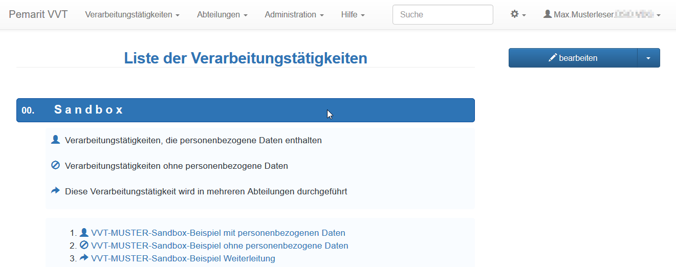 Anwender welche redaktionell mit dem System arbeiten, können für ihre ersten Schritte eine Sandbox nutzen. Für einen schnellen Einstieg in das System stehen dort anschauliche Muster von Verarbeitungstätigkeiten bereit.