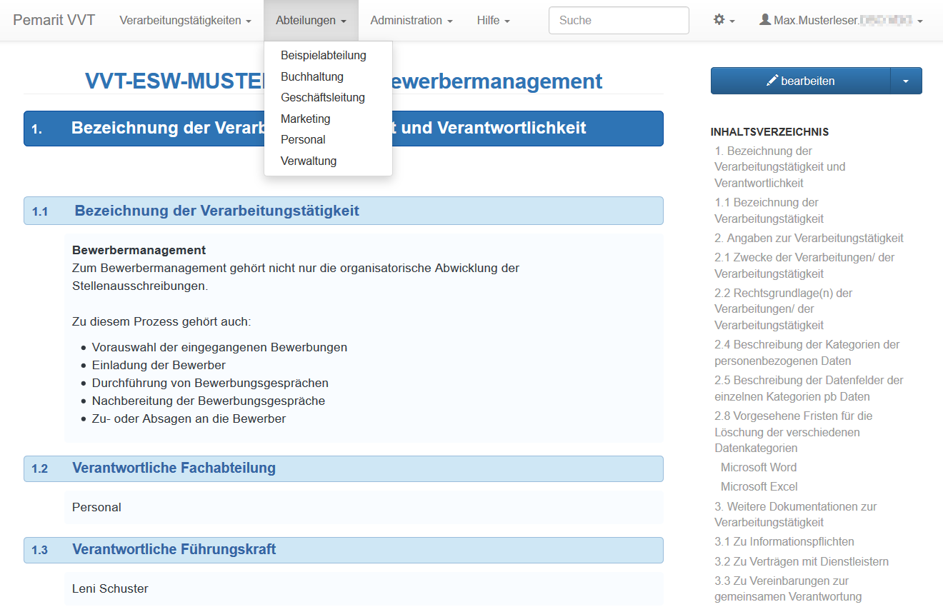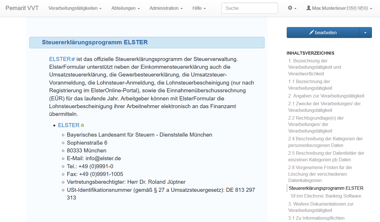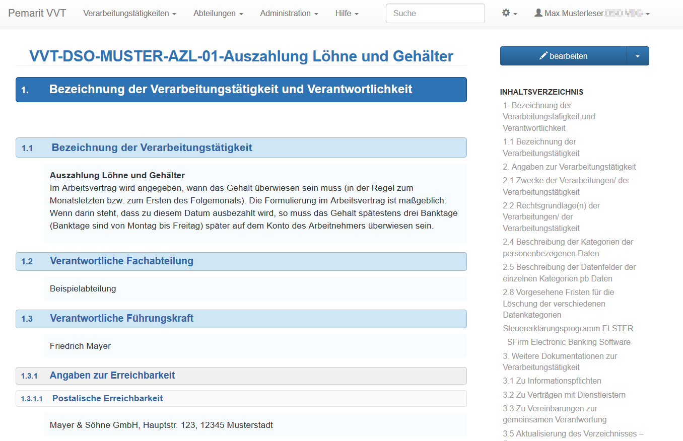 Jede Verarbeitungstätigkeit wird in einer formularähnlichen Darstellung ausführlich dokumentiert. Zur schnellen Navigation verfügt das System über ein automatisch erstelltes Inhaltverzeichnis mit dessen Hilfe einzelne Punkte des Formulars mit einem Mausklick angesteuert werden können.