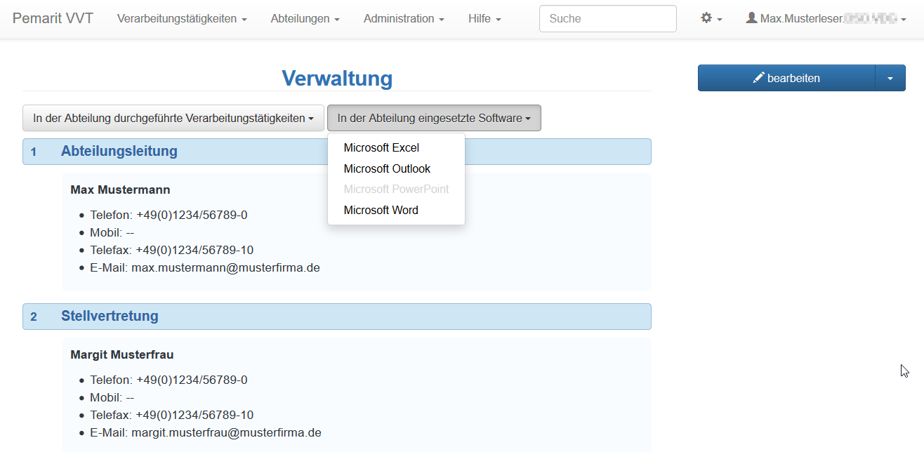 Nach der Auswahl einer Abteilung erscheint die Hauptseite der gewählten Abteilung. In dieser Seite werden die für den Datenschutz verantwortlichen Personen mit ihren Kontaktdaten aufgelistet. Im Menüpunkt „In der Abteilung durchgeführte Verarbeitungstätigkeiten“ kann eine Liste der Verarbeitungstätigkeiten in dieser Abteilung geöffnet werden.  Im Menüpunkt „In der Abteilung eingesetzte Software“ kann eine Liste der in der Abteilung eingesetzten Software geöffnet werden. Mit einem Mausklick auf einen Eintrag in dieser Liste öffnet sich die Beschreibung der jeweiligen Software.
