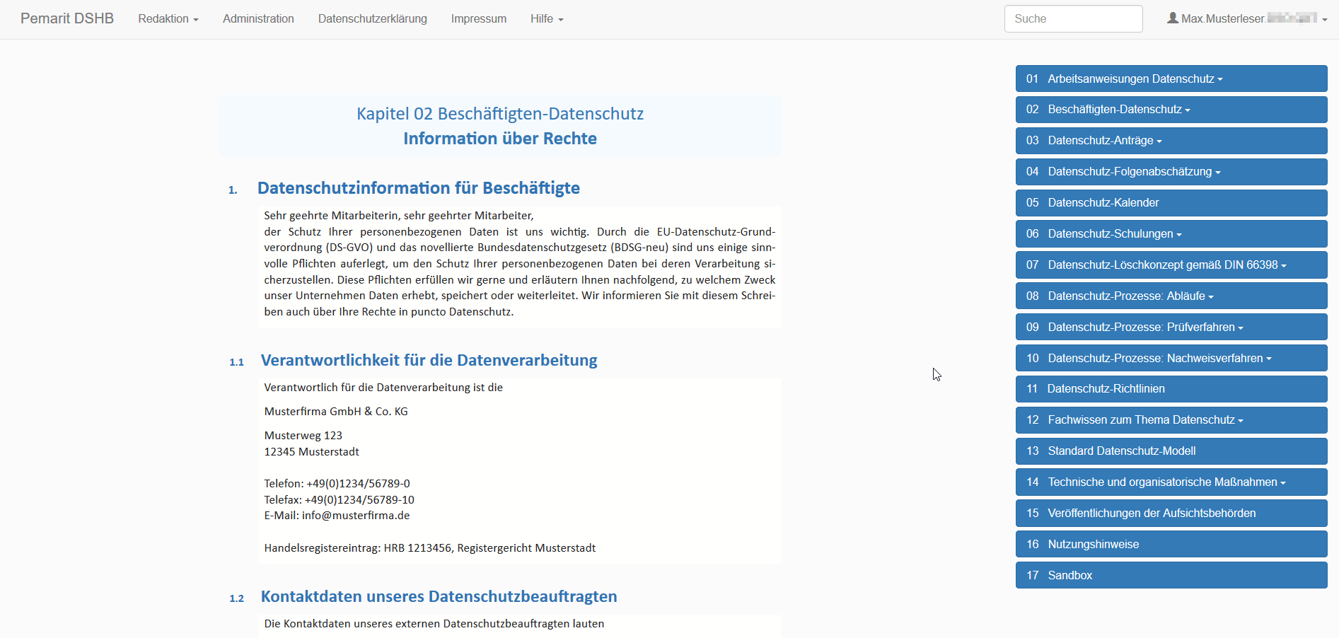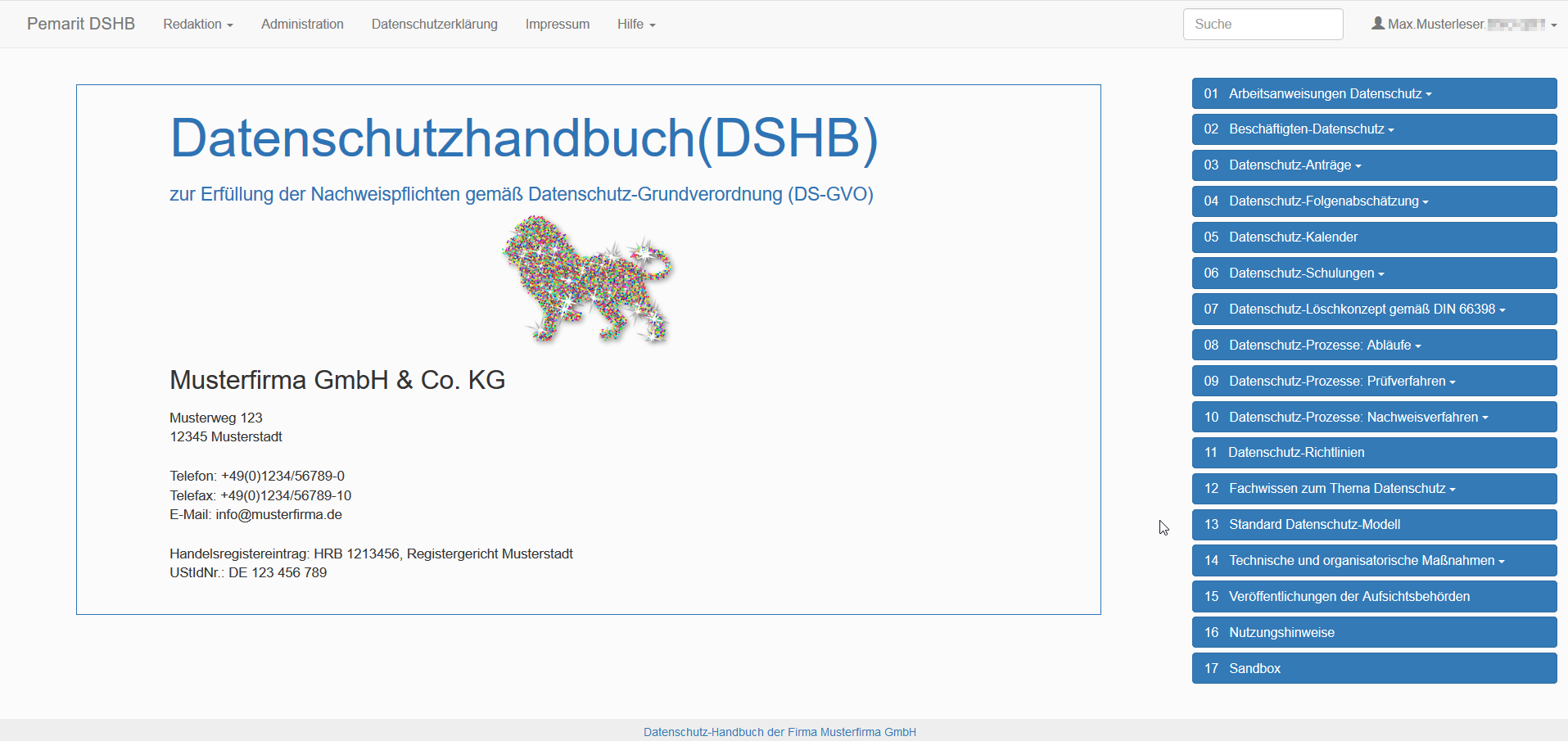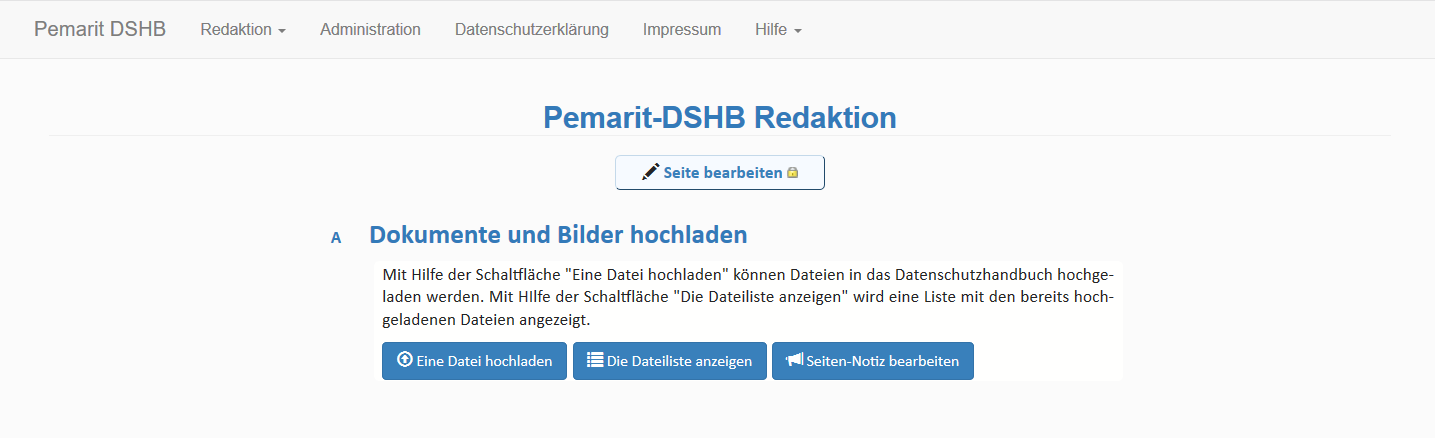 Pemarit DSHB – unter diesen Namen haben wir ein leistungsfähiges maßgeschneidertes System für die Entwicklung und die Veröffentlichung aller Dokumente des Datenschutz-Handbuchs im Intranet oder im Extranet unserer Kunden entwickelt. Das System basiert auf einem ausgereiften LAMP-Stack und verwendet die MediaWiki-Engine. Pemarit DSHB verfügt über eine Versionsverwaltung aller darin gespeicherten Dokumente wie beispielsweise Texte, Zeichnungen, Fotos, Office-Dokumente (u. a. Microsoft Word- und Excel-Dateien, Adobe PDF-Dokumente) und protokolliert sämtliche Bearbeitungen/ Veränderungen/ Erweiterungen und Löschungen von Inhalten. Pemarit DSHB ist revisionssicher und erfüllt die diesbezüglichen Anforderungen an moderne Datenschutz-Handbücher. Der Zugriff auf die Inhalte erfolgt mittels Webbrowser. Die Übertragung der Daten zwischen Pemarit DSHB und dem Webbrowser wird dabei mittels sicherer TLS-Verschlüsselung durchgeführt.
