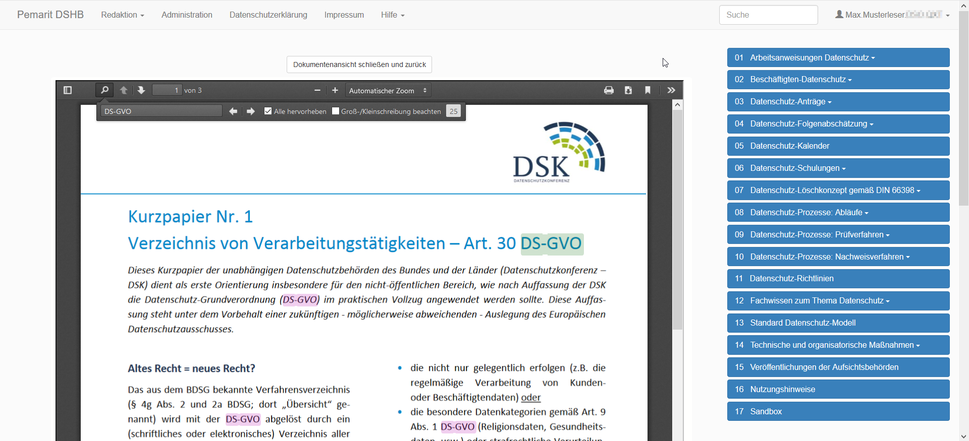 Innerhalb des PDF-Dokuments kann flexibel nach Texten gesucht werden. Im vorliegenden Beispiel wurde als Suchbegriff „DS-GVO“ eingegeben. Bei der Suche ist es möglich, zwischen Groß- und Kleinschreibung zu unterscheiden und alle Fundstellen automatisch markieren zu lassen. Mittels Pfeiltasten kann dann in Vorwärtsrichtung und in Rückwärtsrichtung zwischen den einzelnen Fundstellen des gesuchten Textes navigiert werden.