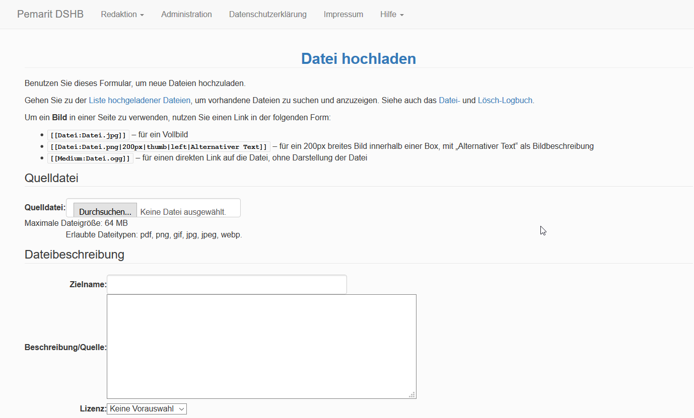 Mit Hilfe einer speziellen Seite können Bild-, Grafik- und PDF-Dateien in das System hochgeladen werden. Um die betreffende Datei in einer Seite sichtbar zu machen, muss diese zuerst hochgeladen und danach in die jeweilige Seitenvorlage eingebunden werden.