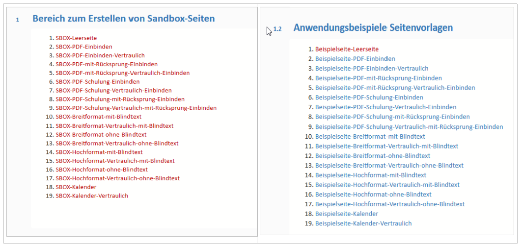 Die Sandbox enthält vorgefertigte Beispiele für die im Pemarit DSHB implementierten Seitenvorlagen. Außerdem sind zu Übungszwecken mehrere leere Seiten enthalten, in die Seitenvorlagen geladen und bearbeitet werden können.