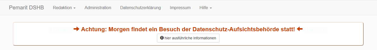 Mit Hilfe dieser Funktion können wichtige Mitteilungen im Datenschutzhandbuch angezeigt werden. Die Anzeige der Mitteilung erfolgt auf jeder Seite des Handbuchs. Zusätzlich können weitere Details zur Meldung auf einer eigenen Informationsseite hinterlegt werden.